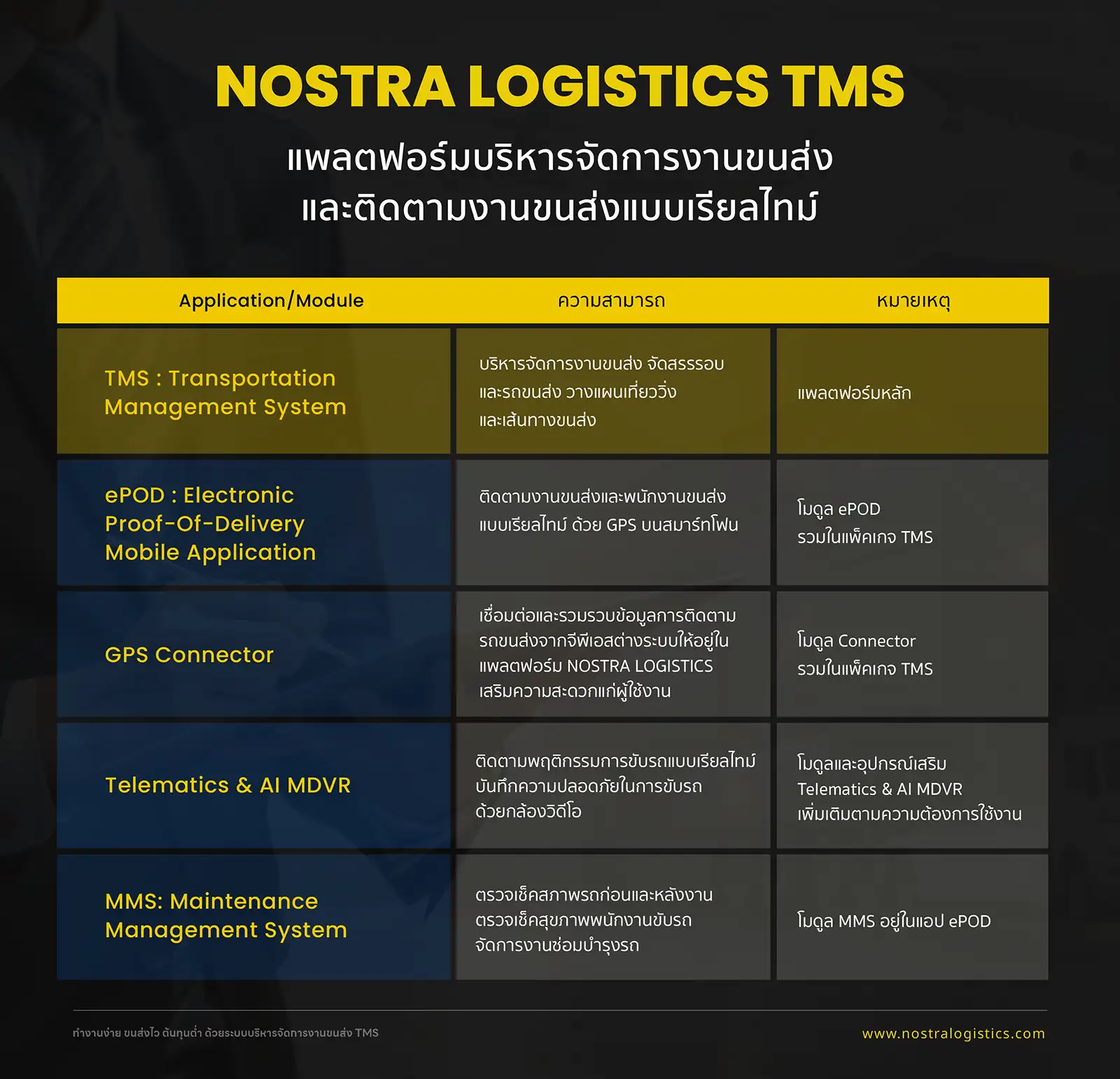 ความสามารถของแพลตฟอร์ม NOSTRA LOGISTICS TMS คือการรวมโมดูลต่าง ๆ ที่เหมาะสมต่อการใช้งานบนแพลตฟอร์มเดียว และสามารถเลือกใช้งานได้ตามต้องการในแพ็คเกจเดียว ได้แก่