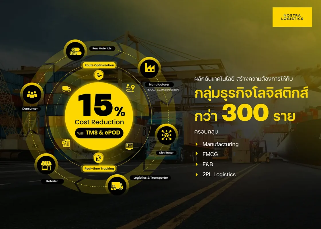 จุดต่างที่ทำให้ NOSTRA LOGISTICS ยืนหนึ่งเป็นผู้นำด้านแพลตฟอร์มเทคโนโลยีขนส่งโลจิสติกส์ของไทยนั้น คือการนำระบบบริหารจัดการขนส่ง TMS (Transportation Management System) ทำงานร่วมกับโมบายแอปพลิเคชันสำหรับติดตามด้วยมือถือ ePOD (Electronic Proof of Delivery) ลดต้นทุนค่าฮาร์ดแวร์ ยกระดับประสิทธิภาพการทำงาน ตั้งแต่การจัดรถ การวางแผนเส้นทาง การจัดรอบวิ่งรถ ไปจนถึงการติดตามสถานะการจัดส่งและปิดงานพร้อมหลักฐานการจัดส่งแบบเรียลไทม์ ช่วยลดเวลาการวางแผน ลดรอบวิ่งรถที่ซ้ำซ้อน เพิ่มความแม่นยำในการส่งมอบสินค้า (On-Time Delivery) ที่สำคัญคือสามารถพัฒนาระบบให้เข้ากับกระบวนการทางธุรกิจของพันธมิตรเพื่อตอบโจทย์การทำงานอย่างสมบูรณ์ ซึ่งทำให้ผู้ประกอบการสามารถบริหารต้นทุนในแต่ละขั้นตอนได้อย่างมีประสิทธิภาพ สะท้อนถึงการเติบโตของเทคโนโลยีนี้อย่างต่อเนื่อง และสร้างความต้องการให้หลายอุตสาหกรรม ครอบคลุมตั้งแต่