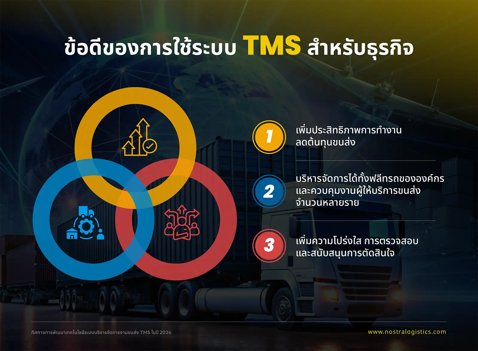• เพิ่มประสิทธิภาพการทำงาน ลดต้นทุนขนส่ง: TMS ช่วยสนับสนุนการทำงานทุกกระบวนการ ทั้งการบริหารทรัพยากร จัดการแผนงาน ควบคุมต้นทุนการขนส่ง ลดการใช้น้ำมัน และจัดการด้านการเงิน เช่น เลือกรถขนส่งตามประเภทและขนาดที่เหมาะสม จัดโหลดบรรทุกสินค้าให้พอดี วางแผนเส้นทางจัดส่ง จัดตารางเวลาและเที่ยววิ่งรถ บันทึกข้อมูลค่าใช้จ่าย