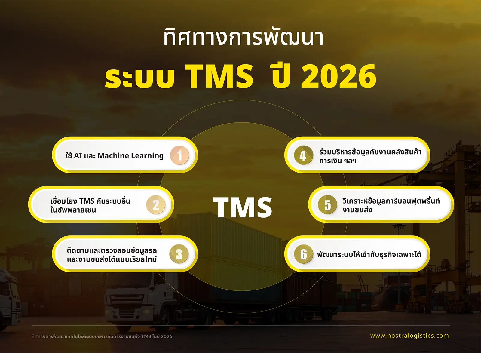 ทิศทางการพัฒนาระบบ TMS สำหรับปี 2026 สอดคล้องกับเทคโนโลยีสมัยใหม่และความต้องการของภาคธุรกิจ ได้แก่